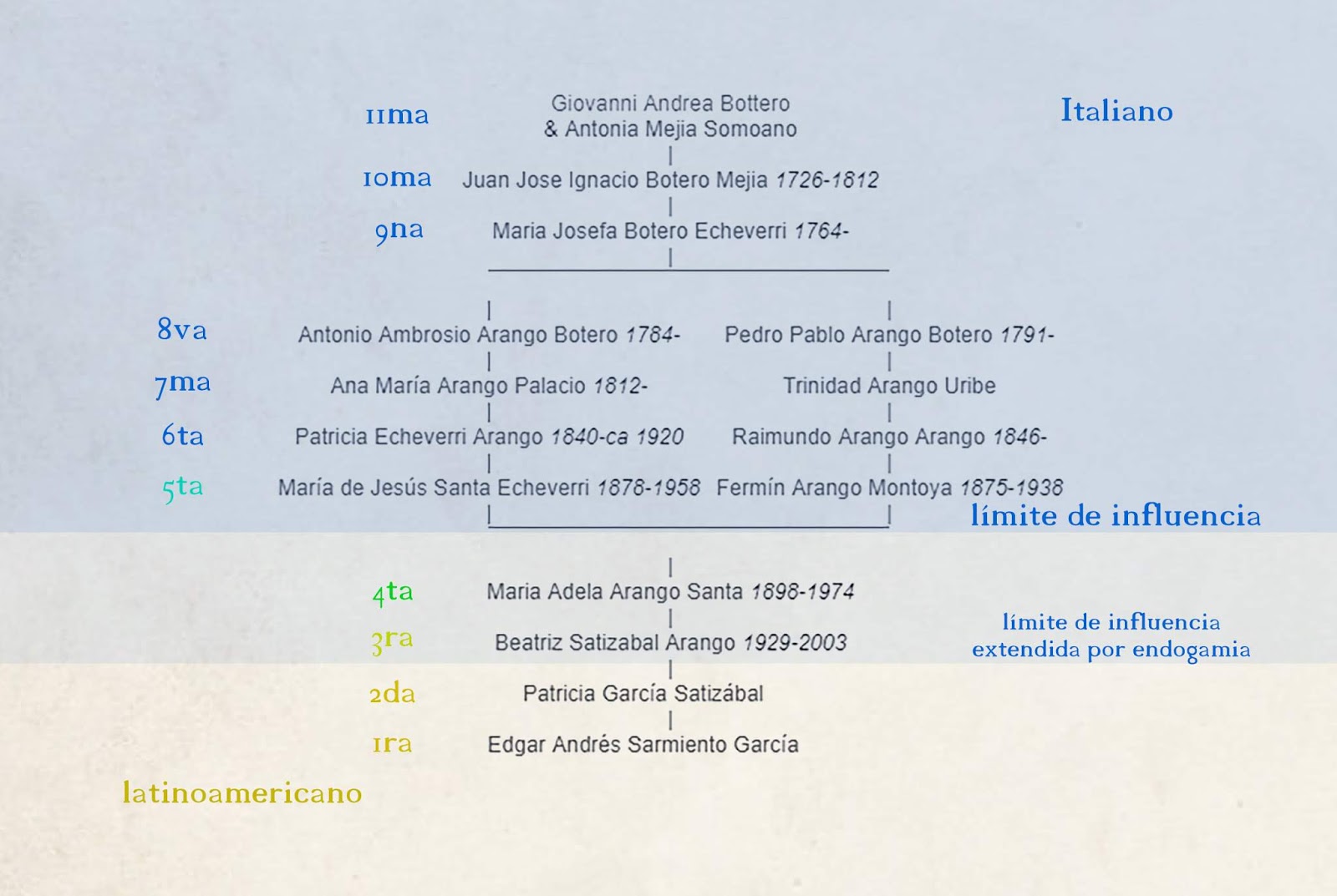 Aunque mis padres no comparten ADN, según los resultados de coincidencia, mi mamá posee un pequeño porcentaje de italiano a considerar, que no se sabe todavía de dónde viene (una parte del porcentaje puede venir de Giovanni, pero no en su totalidad, o puede ser que se haya reforzado por la endogamia, o porque hay sospechas que sus padres compartían también ADN), y si no existiera este porcentaje italiano, sería más fácil deducir ciertos resultados. Lo que sí es contundente es que hay una “inserción temprana” Italiana por el lado de mi padre y que corresponde a inicios del siglo XX, un patrón distinto al que se estaba llevando en la colonización y conquista Española y una proveniencia lejana de Colombia. Debido a esto hay un porcentaje que debería ser inamovible y es el Italiano. Como ven mi abuela paterna es nacida en Brasil, de hijo italiano, y tuvo sus hijos en Colombia, por lo que no se puede considerar como una incrustación Brasileña en Colombia sino Italiana en Colombia, un salto poblacional o tránsito, y es difícilmente identificable en un ADN, lo que sí tiende a ser más identificable es la incrustación Italiana en Brasil del padre de mi abuela paterna, ya que tuvo una larga descendencia en el mismo a la que ya va en la 5ta-6ta generación, a 1-2 generaciones del límite autosomal próximo. La relación Peruana debido a su condición similar a la latina por ahora es difícil diferenciarse con la Colombiana. Las inserciones tardías son aquellas que se dan más allá de los dos siglos del referente o que superan las 8-9 generaciones, estas no deberían estar presentes como porcentajes étnicos cercanos, aunque lo están, dependiendo del banco de referencia. Ejemplo es el de Giovanni Andrea Bottero, tratado con anterioridad.
